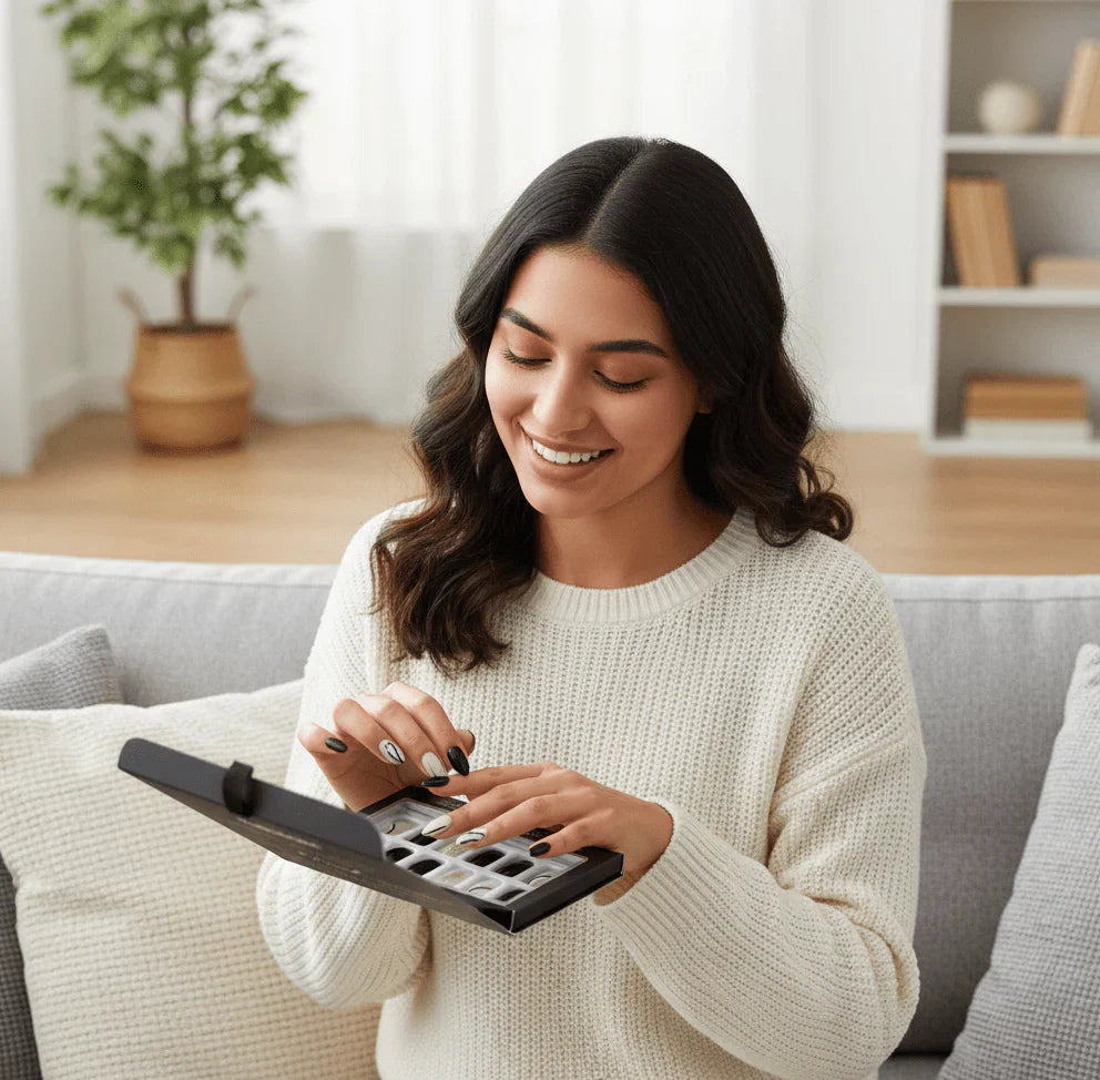 Create a bold yet elegant manicure in seconds with the Febble® Black Nude Glitter Press-On Nails. This stylish set blends glossy black nails, soft nude shades, and sparkling silver glitter—finished with wave accent designs for a premium, modern look. Perfect for parties, events, office wear, or daily fashion styling.